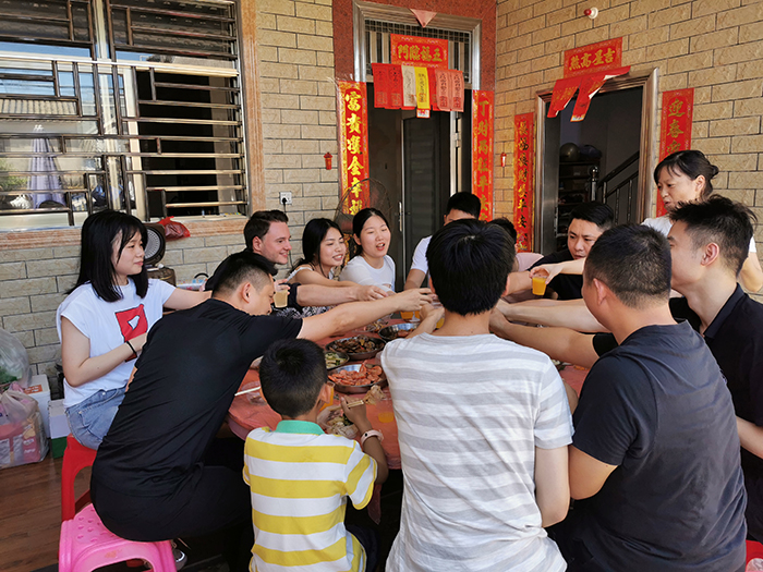 中午,我們進(jìn)住民宿。安頓好行李后,我們共進(jìn)午餐,感覺到生活的新鮮與愜意。豐盛的佳肴,濃香的美酒,讓我們沉浸在歡樂的氣氛中,享受著工作勞頓后帶來的無比快樂。舉杯,道聲辛苦了;舉杯,互致祝福。品生活芳香,享生活甘甜。團(tuán)隊(duì)人不光在工作中有拼勁,而且在酒桌上也毫不含糊,舉杯,一飲而盡。